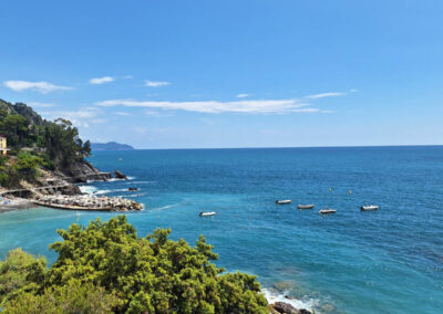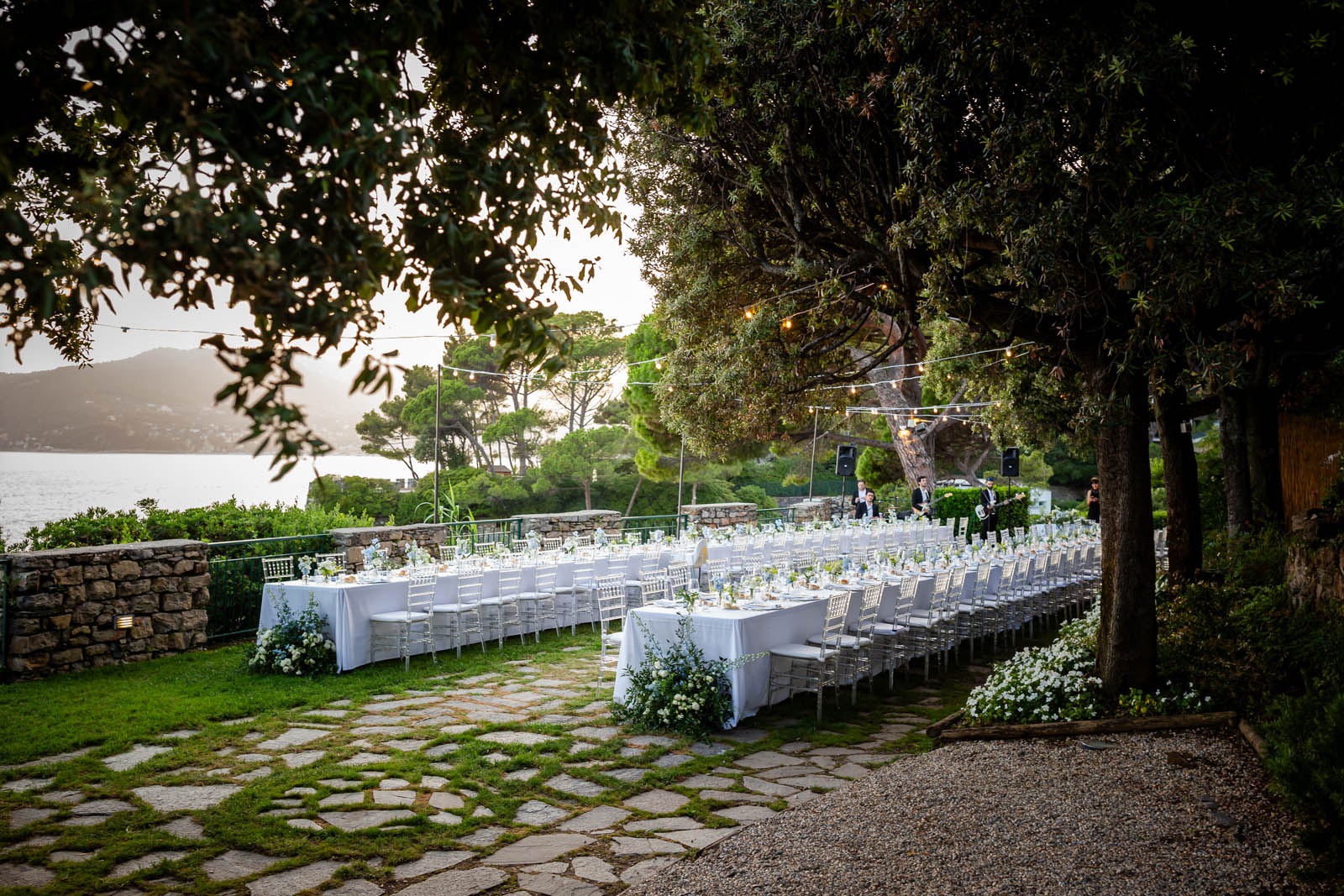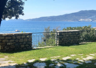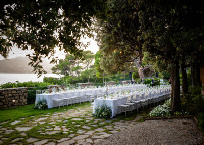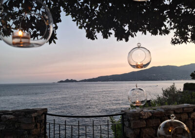 L’ampia terrazza con vista Portofino, si affaccia direttamente a sud. Composto da due prati ombreggiati da imponenti pini marittimi e lecci, può ospitare comodamente circa 200 persone sedute; se il rinfresco è a buffet, la capienza può superare le 300 persone.