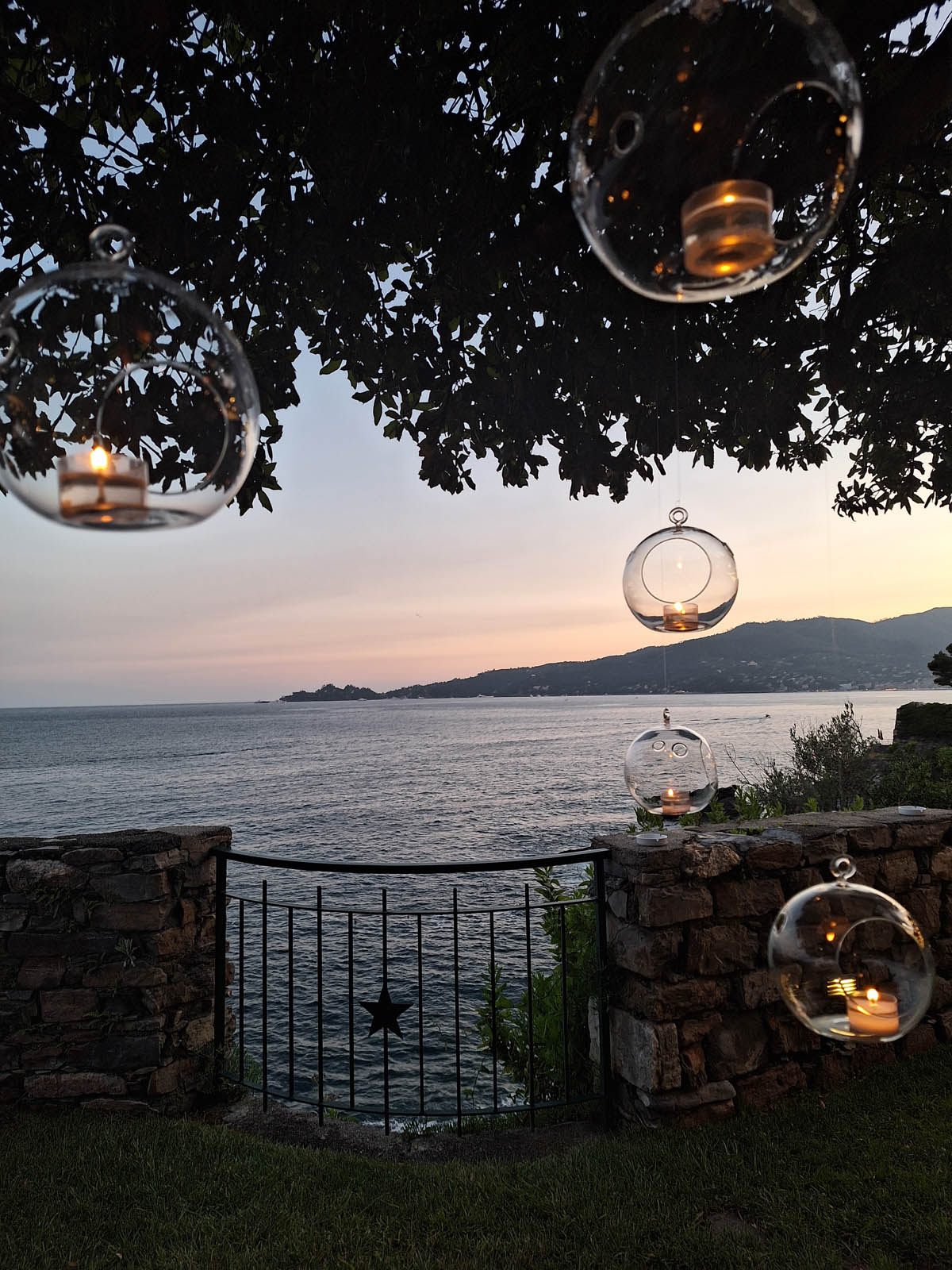 Il Giardino della Baia di Zoagli si affaccia a est, offrendo una vista sulla costa fino a Punta Manara, oltre Sestri Levante. Al centro si trova un elegante gazebo bianco, sorretto da otto colonne in ferro battuto su cui si arrampicano gelsomini e rose. Di notte, la Baia di Zoagli si trasforma in un incantevole scenario color smeraldo, grazie ai quattro grandi riflettori integrati negli archi del Ponte delle Ferrovia. Questo giardino è spesso scelto per l'aperitivo di benvenuto, poiché la maggior parte degli ospiti arriva a piedi dal paese. Il gazebo può accogliere circa 200 persone in piedi e 150 sedute.